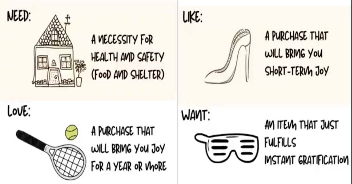 Look at your expenses over the past year: how do your Needs, Wants, Likes, and Loves stack up? Are you spending more on Wants and Likes than Loves? This often happens as Loves tend to be bigger ticket, pricier items.