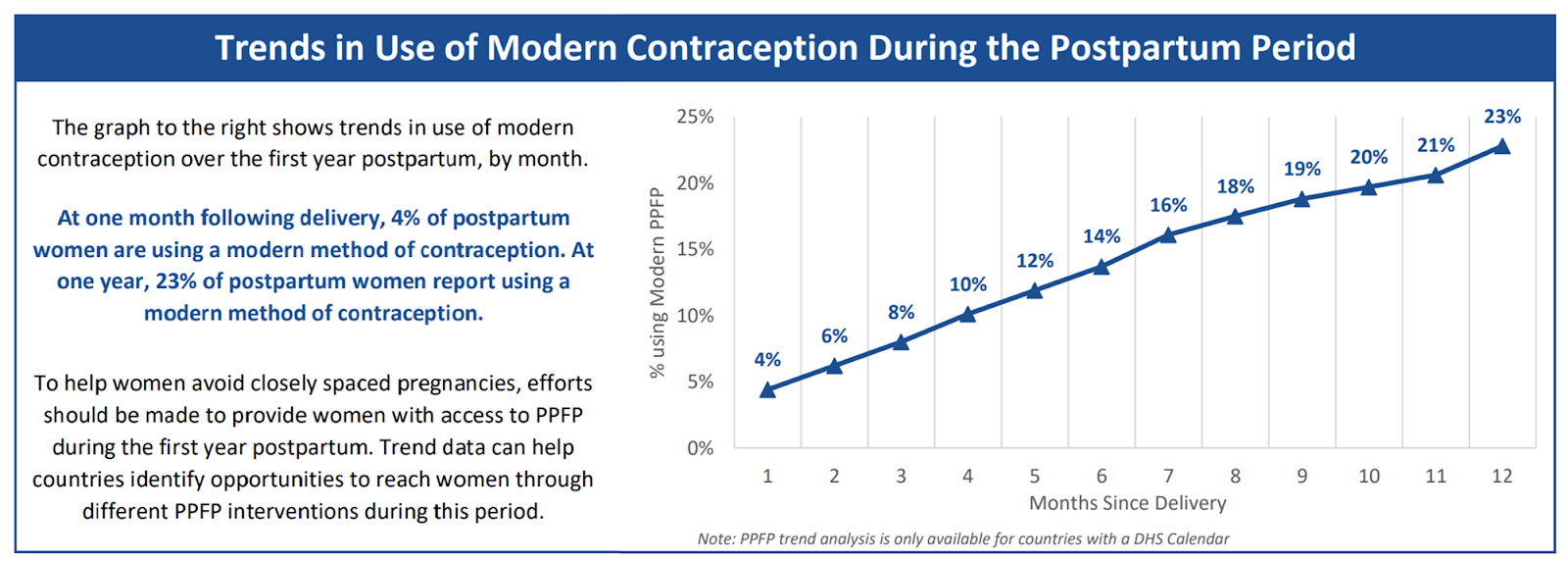 Second, the postpartum period is one of the only points at which many women in LMICs will interact with the formal healthcare system. This period is one of the few opportunities for women to safely access a wide range of contraceptive options. Despite this, contraceptive uptake in the postpartum period is consistently lower than average national rates (Pasha et al., 2015; Track20, n.d.).