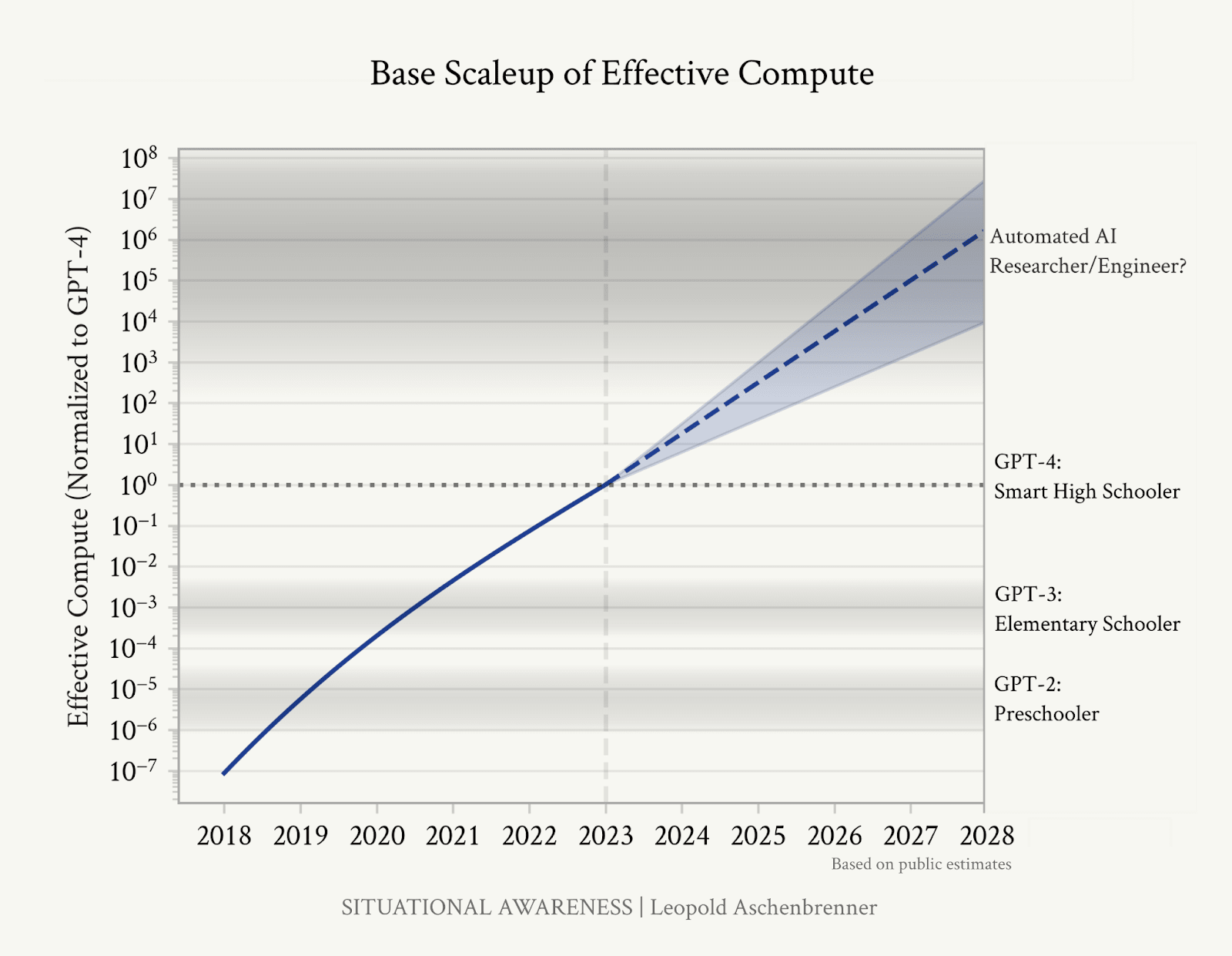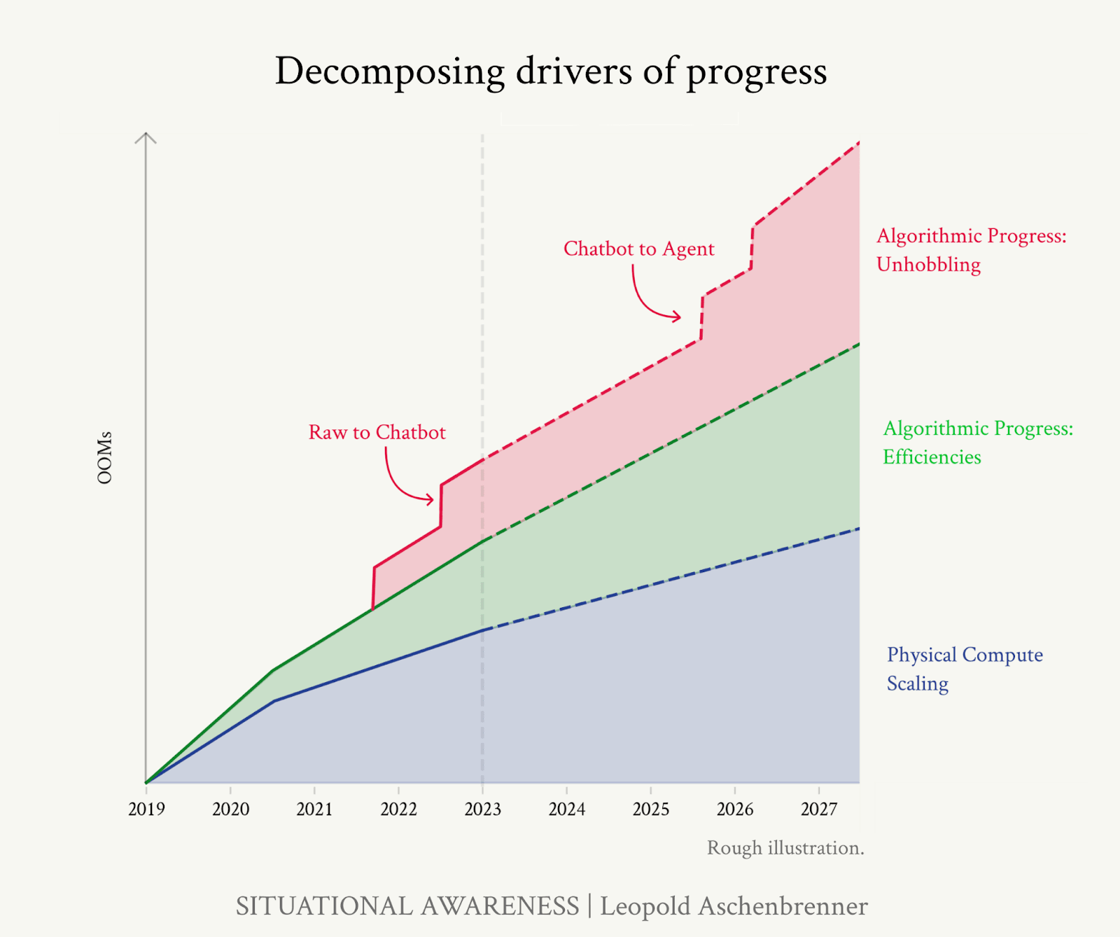 “We are racing through the OOMs, and it requires no esoteric beliefs, merely trend extrapolation of straight lines, to take the possibility of AGI—true AGI—by 2027 extremely seriously.”