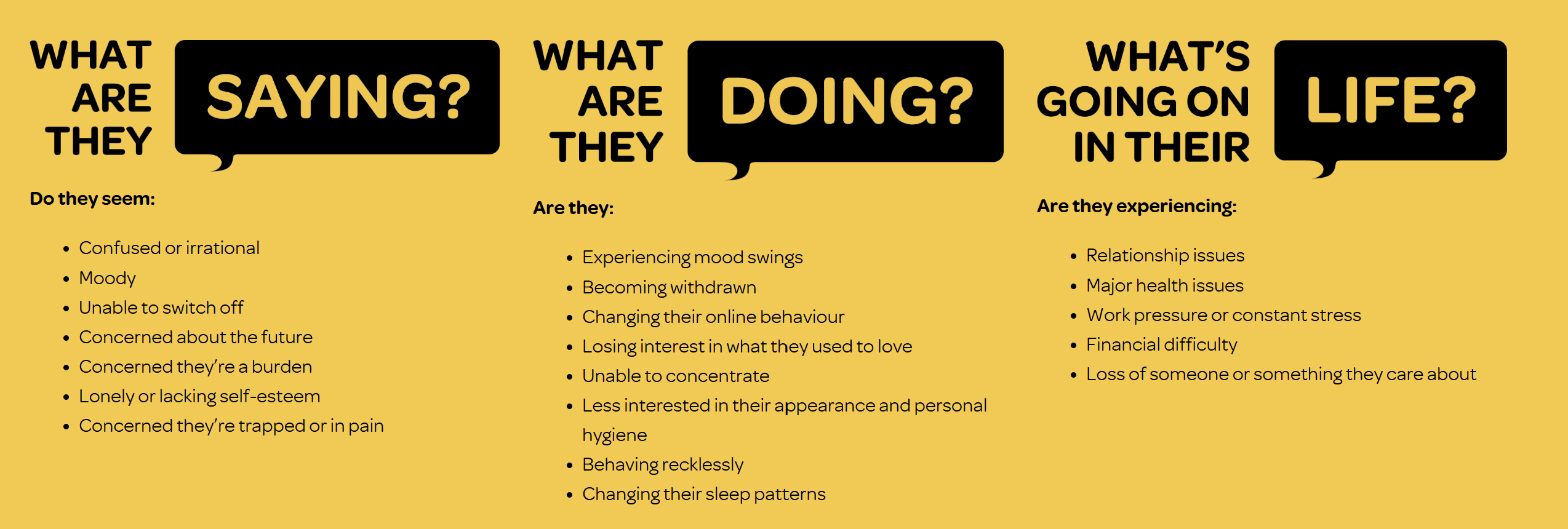 You can start by letting them know about your concerns, for example: “You don’t seem yourself lately – want to talk about it?” If they seem uncertain, it’s ok to directly ask if they are experiencing depression or suicidal thoughts.