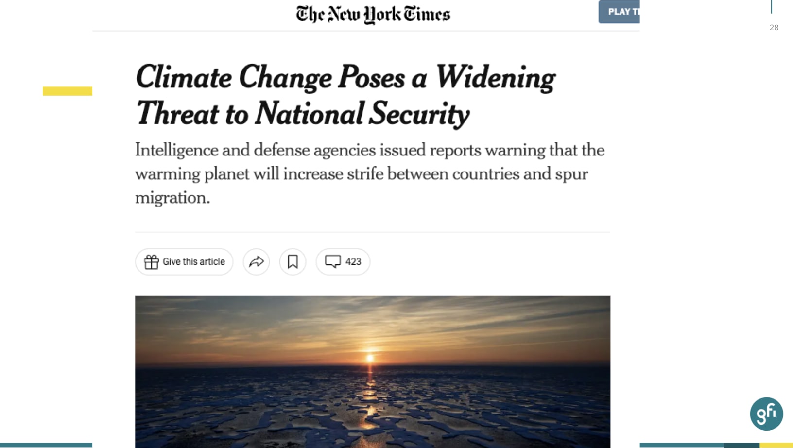 Climate change and existential risk. Ord puts the risk at 1 in 1,000. I’m reading the media, and the media is definitely biased in favor of trying to convince the world to take climate change more seriously. But I will say the degree to which warming is happening faster than anybody predicted 10 years ago and the degree to which the consequences are different and more severe, I think bringing some humility around our capacity to predict, it definitely feels like things could spin more out of control. But even at one in 1,000, Ord said it should be a central global priority, which is where he places it. Then I’ll just remind everyone that the short-term impact of climate change is massive, massive refugee crises and other significant problems, especially in the global south. Climate change poses a widening threat to national security.