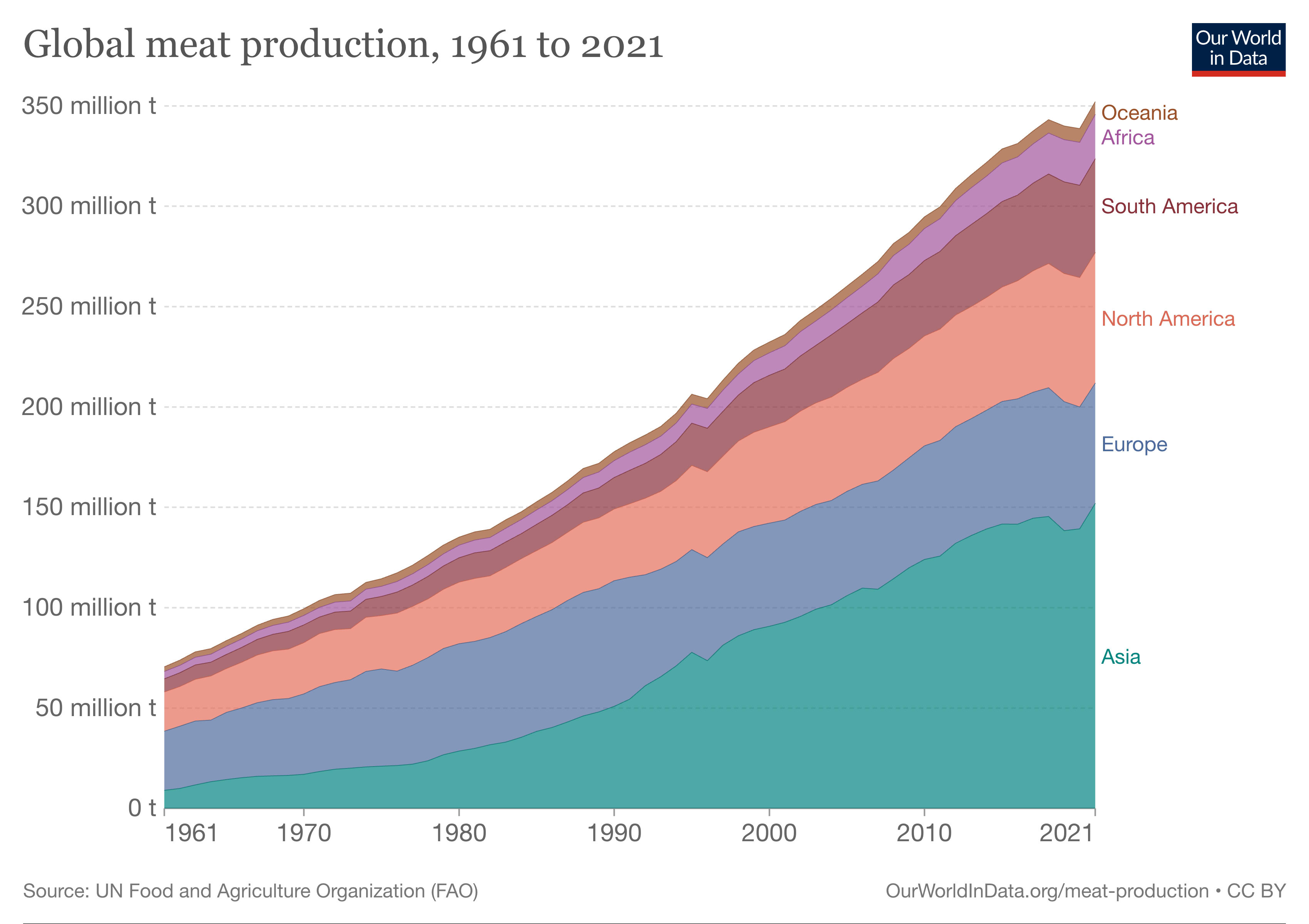The first observation is that, since 1961, global meat production has risen 300 percent.