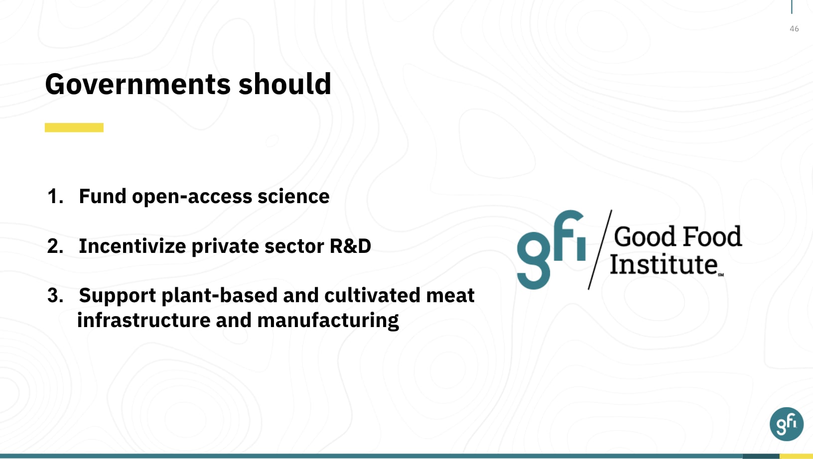 These are some of the resources for scientists which you can find if you go to gfi.org/science. And policy—for our global battle cry, we agree with what I think is a fairly common assumption in EA that if you have a cause area that you can get governments excited about, you can have 100,000x multiplier impact. The way I think about it is, we try to take our budget, which will be about $32 million this year across the six GFIs, and turn it into $10.1 billion in government funding. So we’re really thinking about what it looks like to convince governments that they’re currently funding climate-mitigation efforts, biodiversity efforts, and global health efforts. This is an incredibly tractable and important thing for governments to be setting up research centers focused on and for governments to be incentivizing private-sector activity. So that’s our global battle cry, that governments should be funding this, and $10.1 billion is our current goal, $4.4 billion for R and D, and $5.7 billion for private-sector incentives. And these are just from the last couple of months.