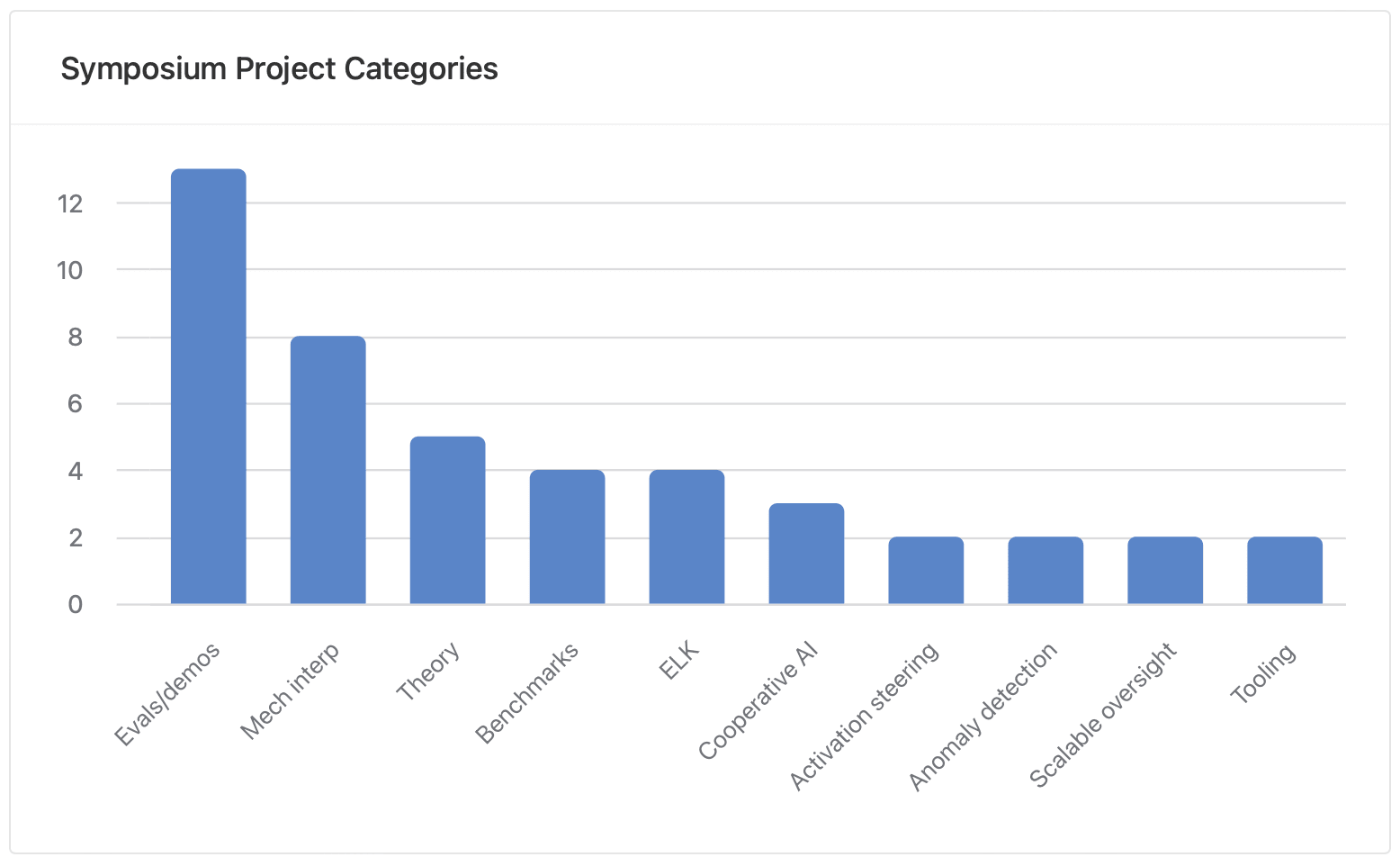 ⅓ of final projects involved evals/demos and ⅕ involved mechanistic interpretability, representing a large proportion of the cohort’s research interests.