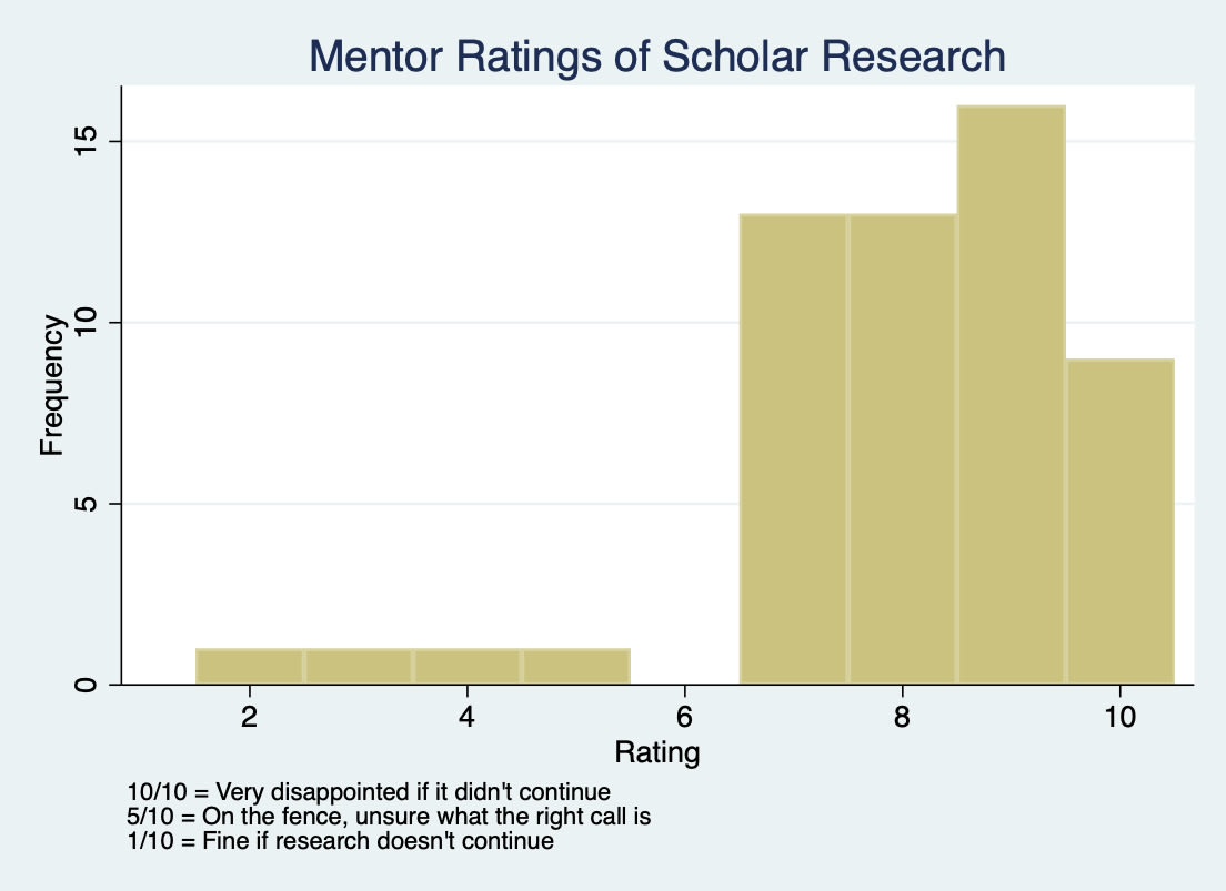 In a survey, we asked mentors, “Taking [depth/breadth/taste ratings] into account, how strongly do you support the scholar’s research continuing?” The average response was 8.1/10 and the Net Promoter Score was 38.