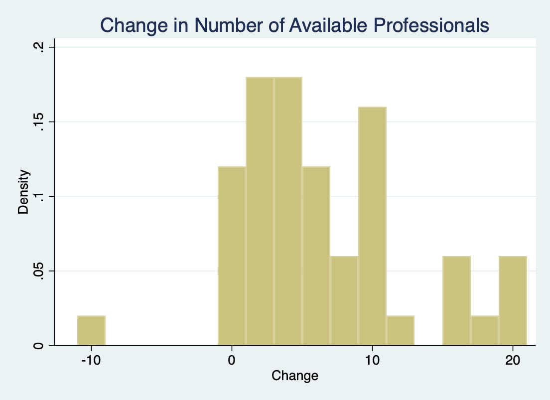The median difference in responses was +4.5. The respondent whose two responses imply a −10 change in the number of professionals they can reach out to first responded “30” and then “20”, so we expect this number is a result of calibration variance.
