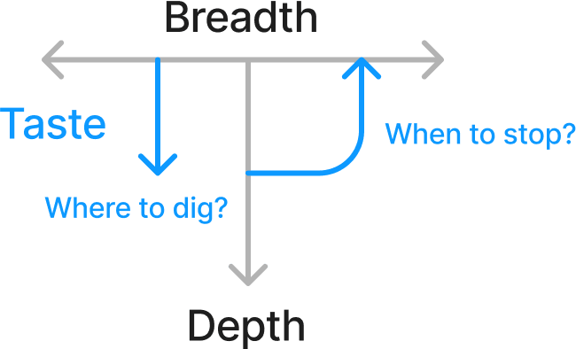 Taste: Good judgment about research direction and strategy, including what first steps to take, what assumptions to question, what novel hypotheses to consider, and when to cease pursuing a line of research.