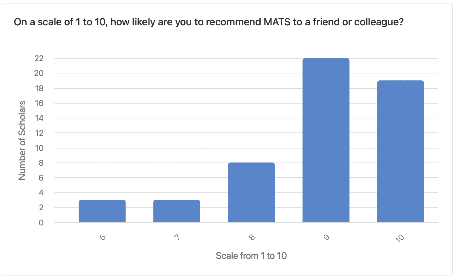 MATS scholars are likely to recommend Scholar Support, our research/productivity coaching service. Average response: 7.9/10.